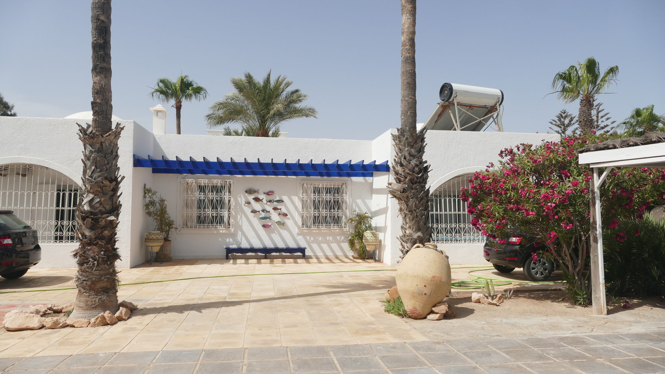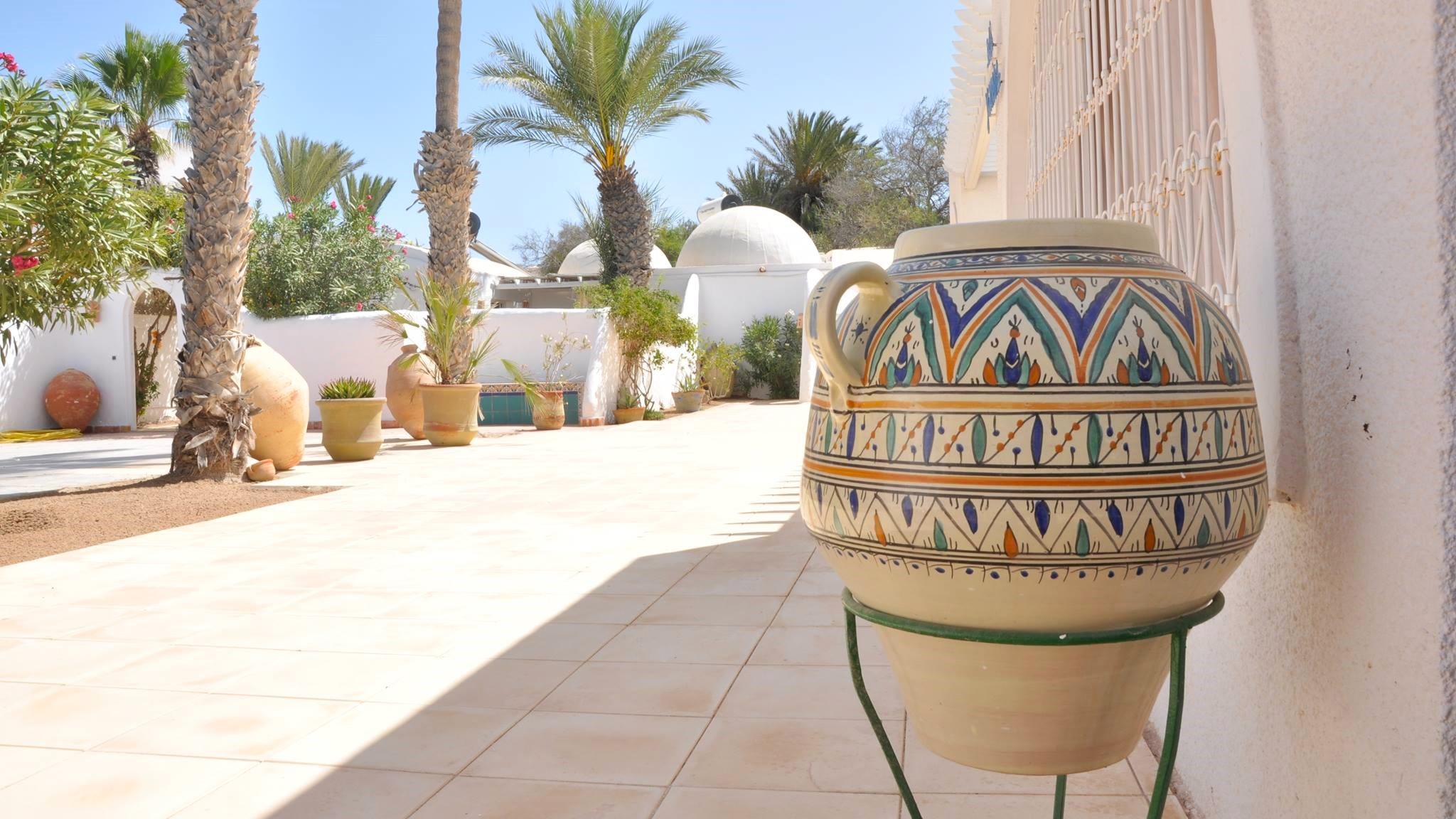 Cazarea am avut-o la Résidence Dar Yasmina situată la vreo 300 m de plajă, în localitatea Mezraya, în partea de est a insulei. Am rezervat pe booking, m-a convins nota foarte bună (9.6) și locația, lângă plajă, cu o grămadă de restaurante și baruri în apropiere, un supermarket și la distanță mică de cele mai importante obiective ale insulei. Plajele celebre ale insulei se află în zona „la lagune”, în estul insulei, așadar dacă vreți să fiți aproape de ele, dar și de capitală, recomand să căutați cazare în zona Mezraya sau Aghir, oricum în partea de est a insulei, cum am făcut noi. Pentru doritorii de hoteluri de tip AI există o mulțime de variante, noi în schimb ne-am dorit, ca de obicei, ceva mai intim și fără mese incluse, pentru a avea libertatea totală de a explora insula și de a experimenta bucătăria djerbiană.