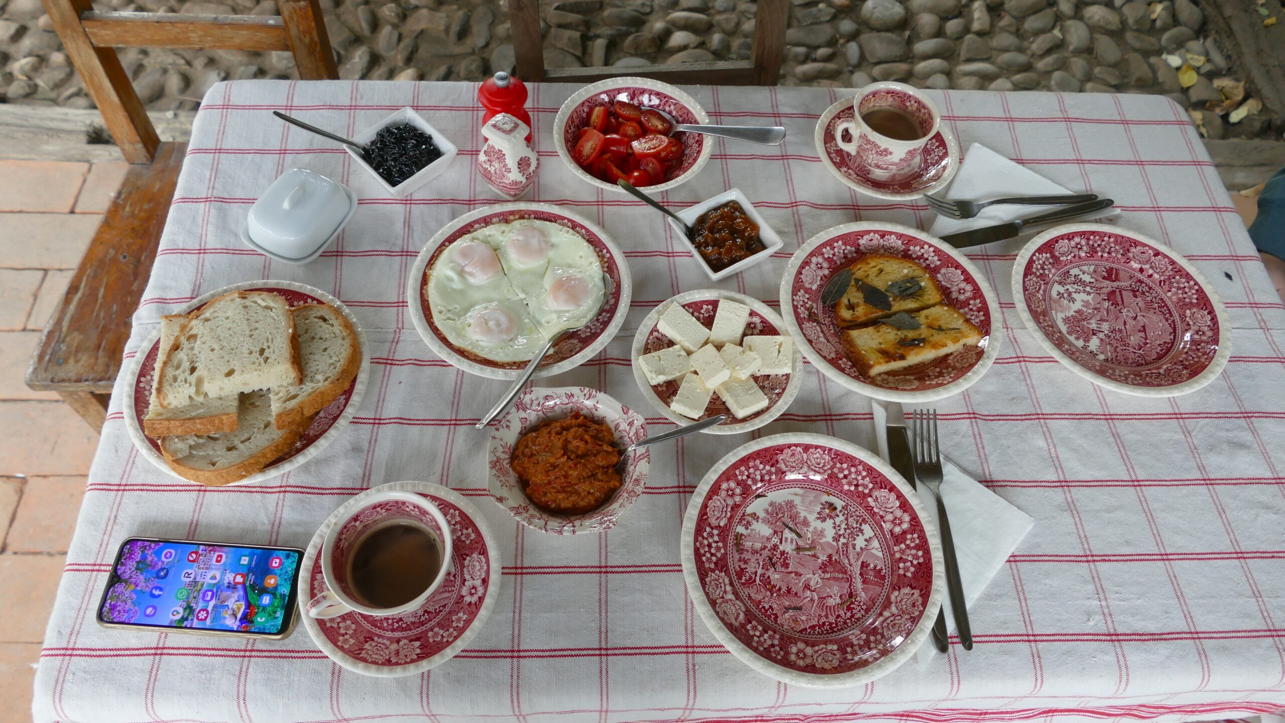 Micul dejun, numai cu produse oraganice și îndestulător, este servit în foișorul din grădină. Cafea de la espressor, ouă de casă, pâine proaspătă din sat, dulceață de piersici și de cireșe negre sălbatice care ne-a colorat dinții în albastru, brânză, unt, roșii, pâine prăjită cu mirodenii, zacuscă de casă. Totul proaspăt, gustos și sănătos, cum rar avem ocazia să mâncăm.