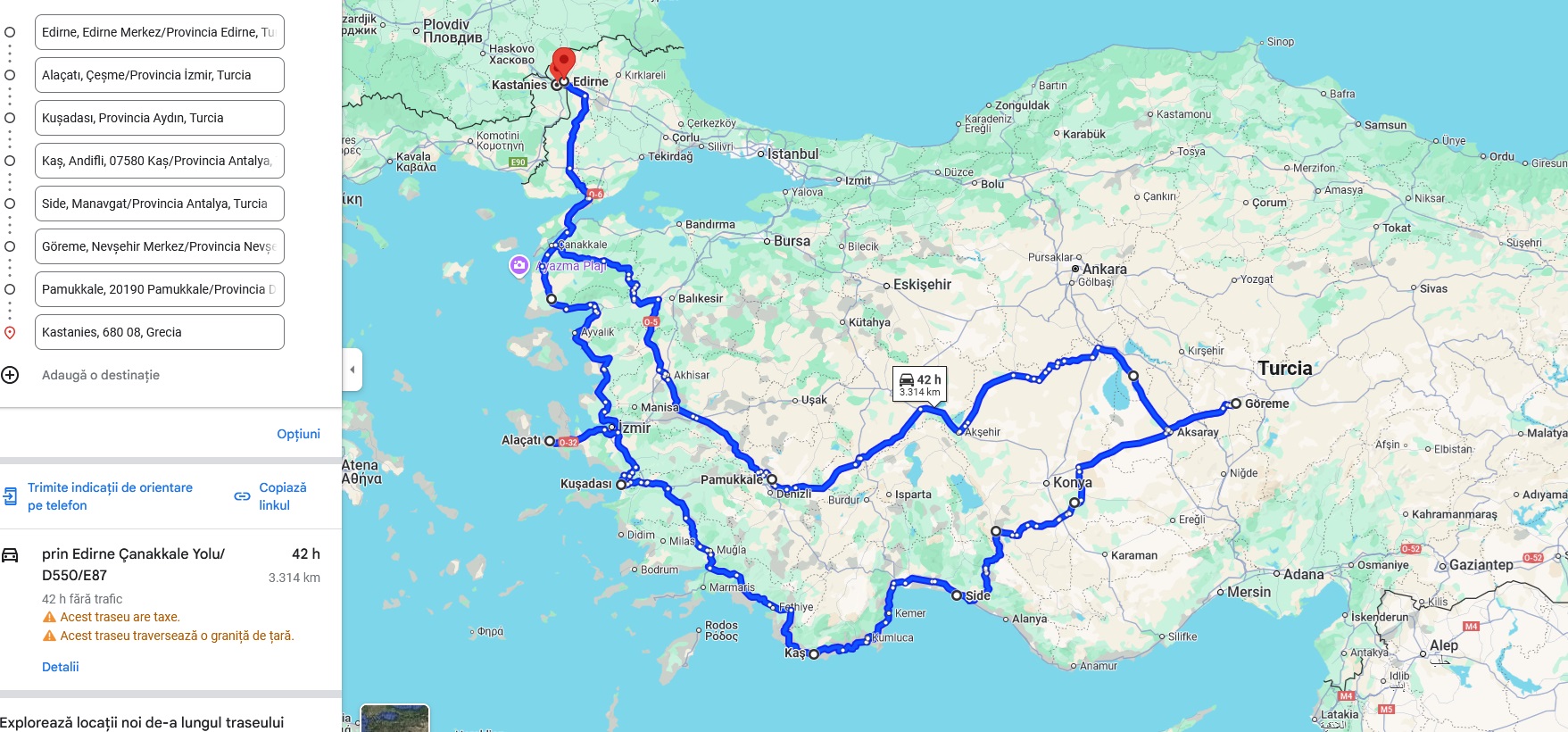 Am pornit din Timișoara pe ruta Moravița-Niș-Dimitrovgrad/Kalotina-Sofia-Kapetan Andreevo/Kapikule-Edirne, în total 13 ore din care statul la vama aprox. 1h 30 min. Inițial voiam să trecem din Bulgaria în Grecia și să intrăm în Turcia pe la Kastanies, dar văzând că drumul e aproape gol ne-am răzgândit și din Bulgaria am continuat direct spre Turcia.